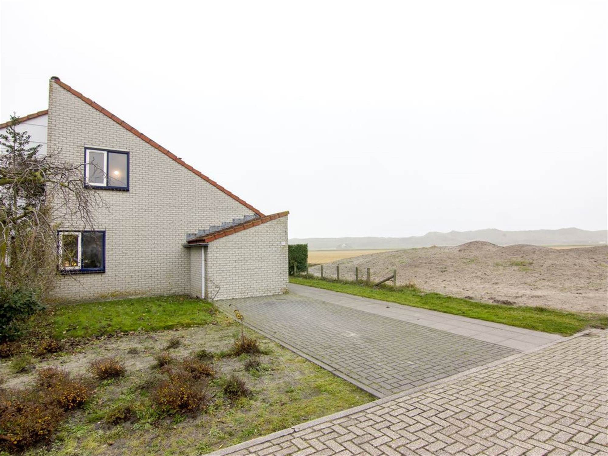 A paved pathway runs through the dunes