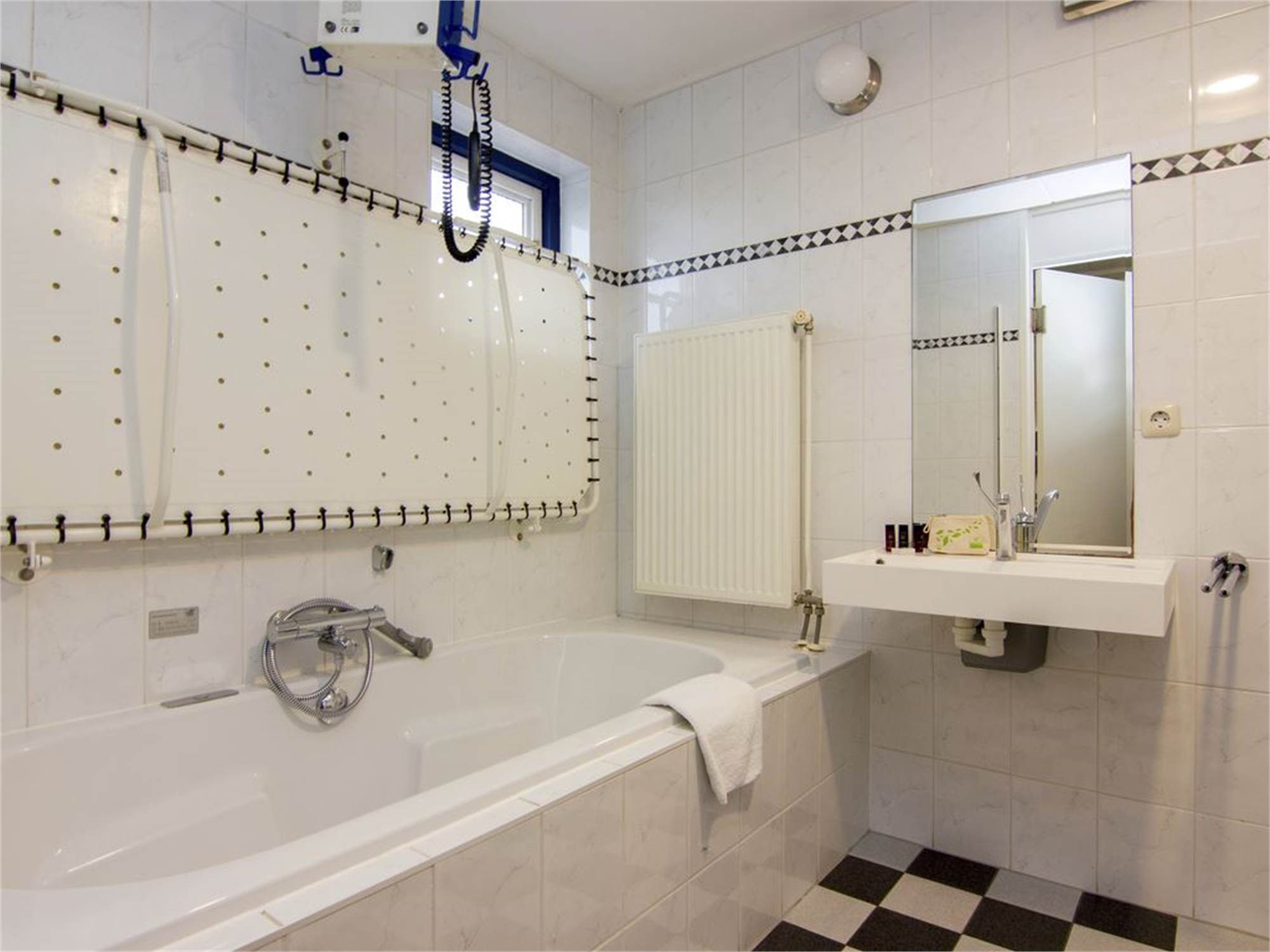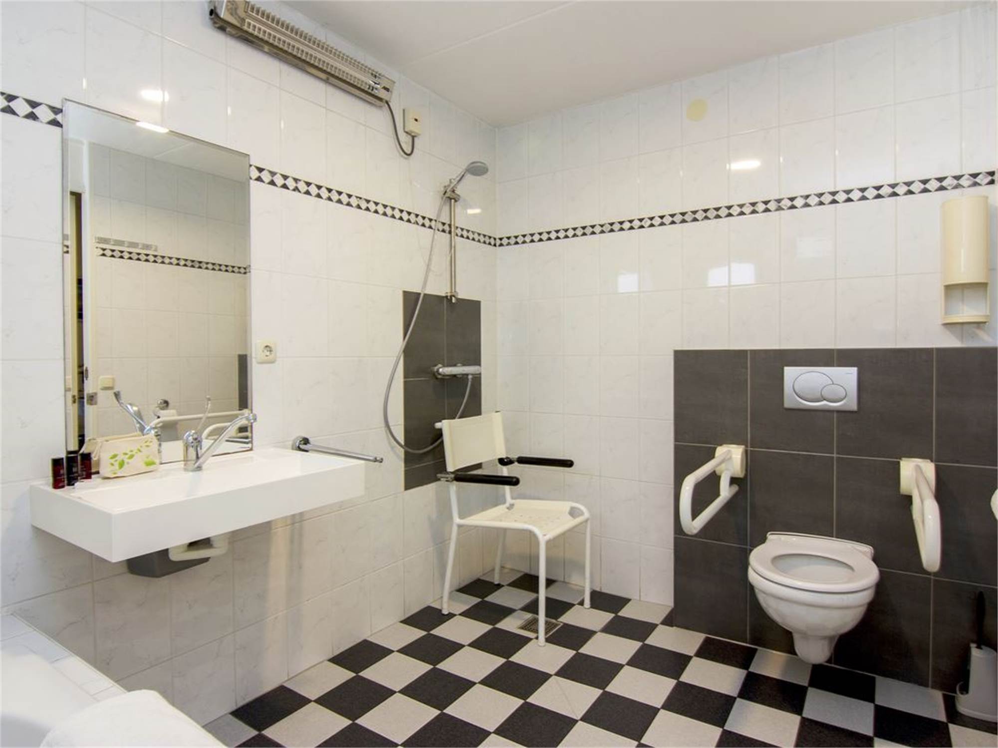 Adapted bathroom with shower cubicle with grab rails and bathtub, fixed shower seat, washbasin a minimum of 78 cm high, wheelchair-friendly and with single lever mixer taps, adjustable mirror, turning circle a minimum of 150 cm and fixed patient lift
