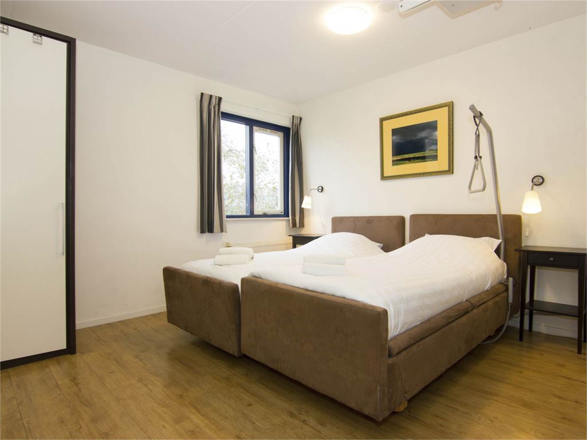 Adapted bedroom with single box spring bed, a high-low bed with monkey pole, siderail and fixed patient lift