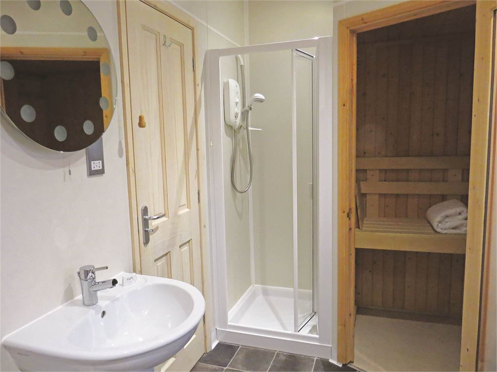 Bathroom with jacuzzi bathtub, shower cubicle, sauna, washbasin and toilet