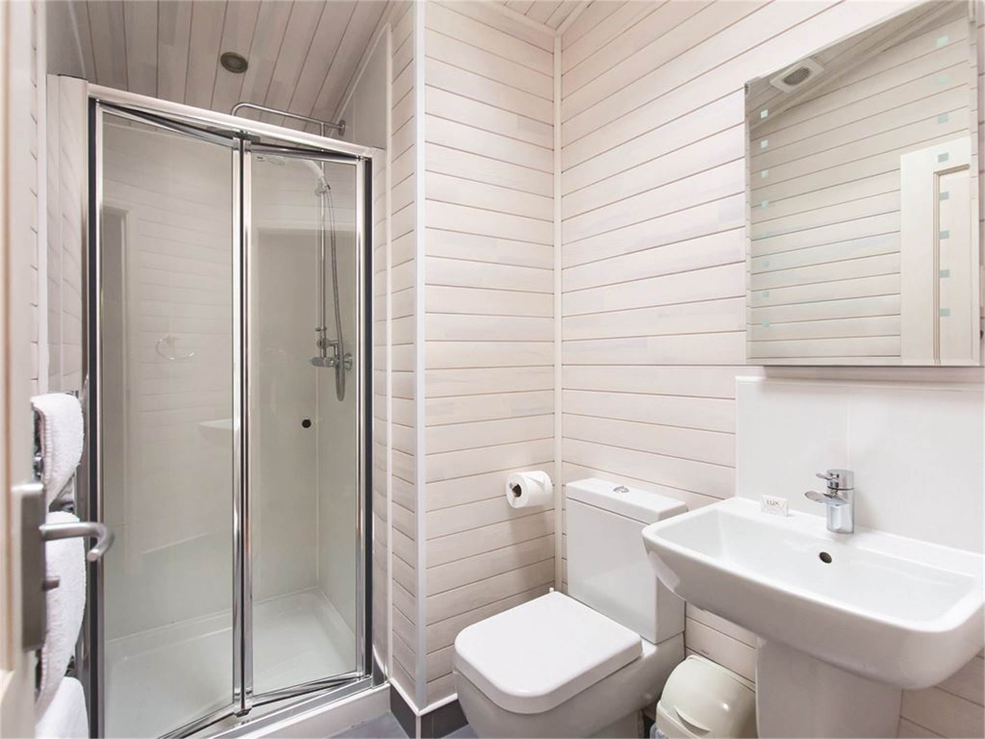 Bathroom with shower cubicle, washbasin and toilet