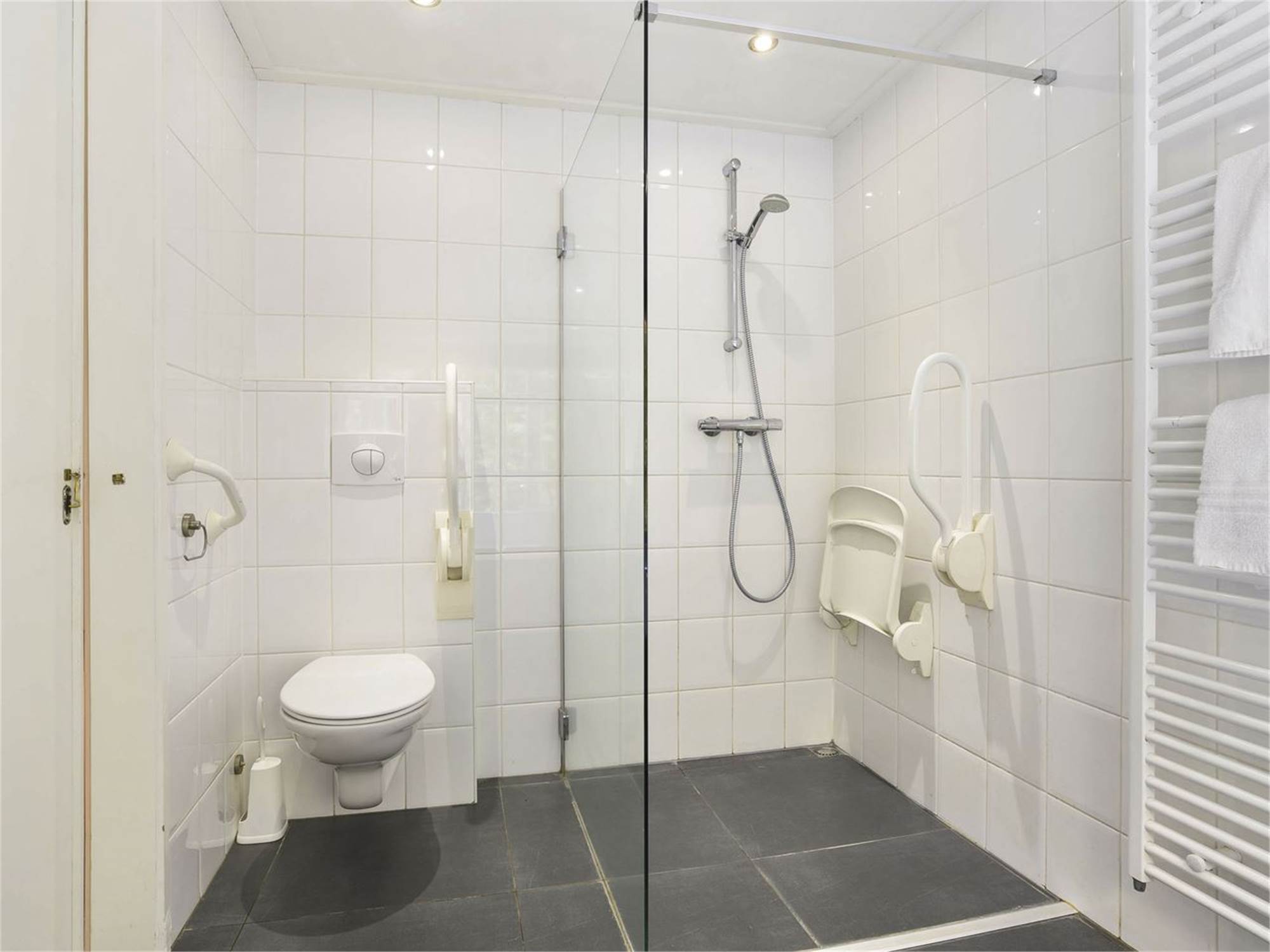 Adapted bathroom with walk-in shower, shower seat with armrest and turning circle a minimum of 120 cm