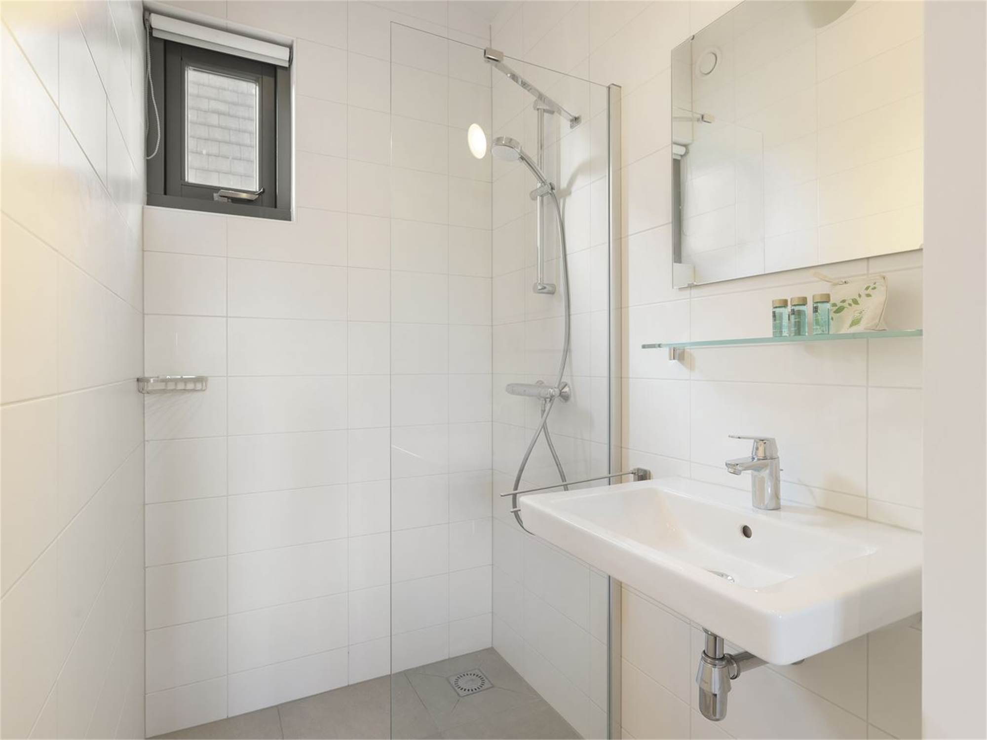 Bathroom with walk-in shower and washbasin