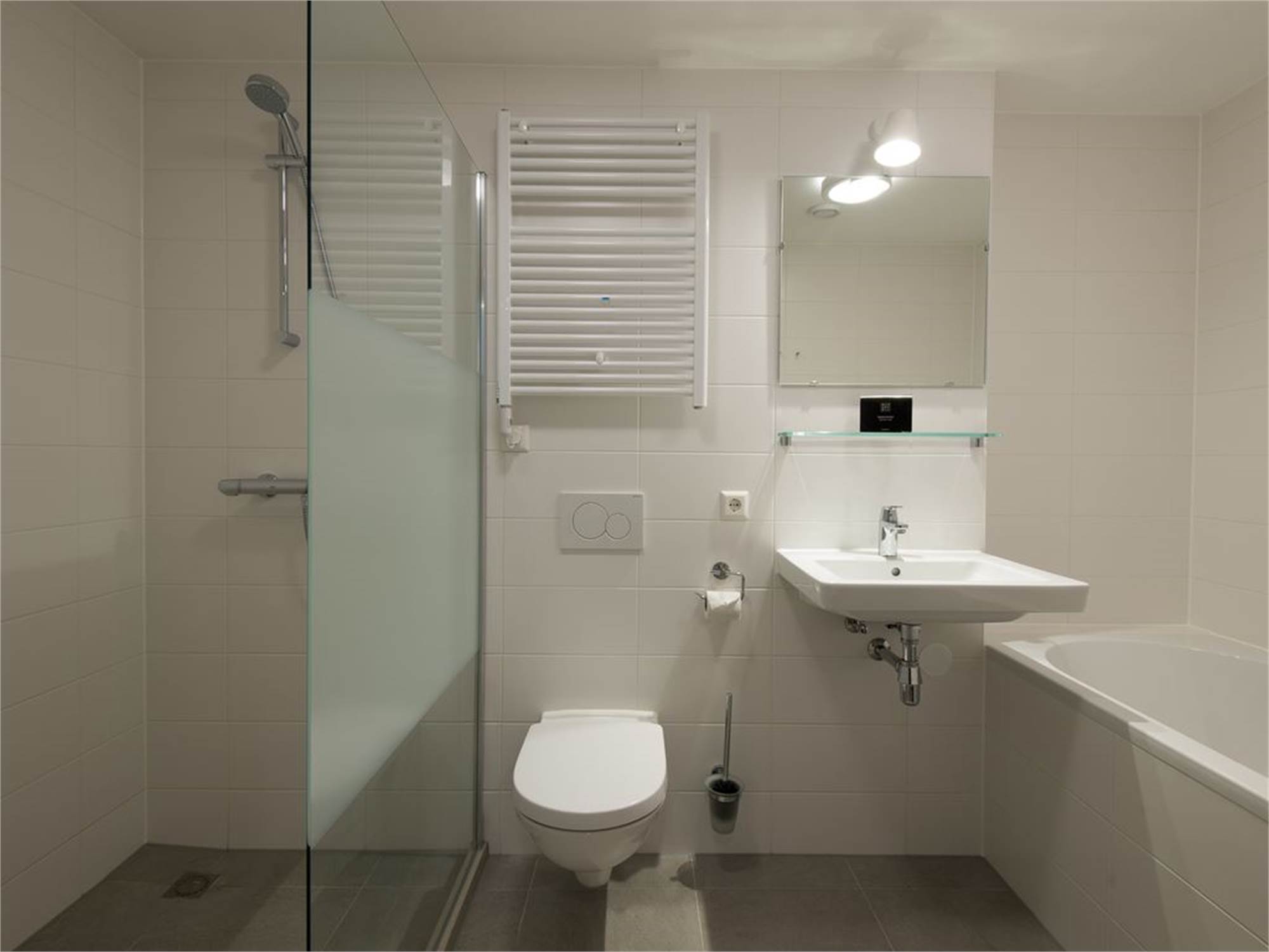 Bathroom with bathtub, walk-in shower, washbasin and toilet in basement