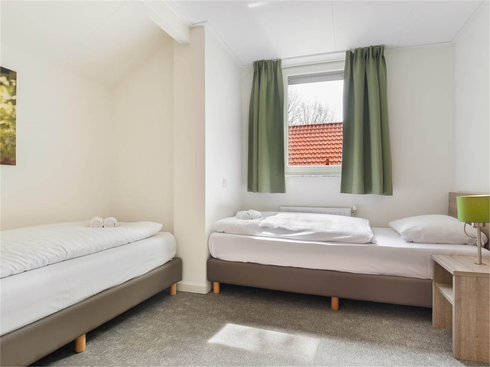 Two bedrooms with two single box spring beds