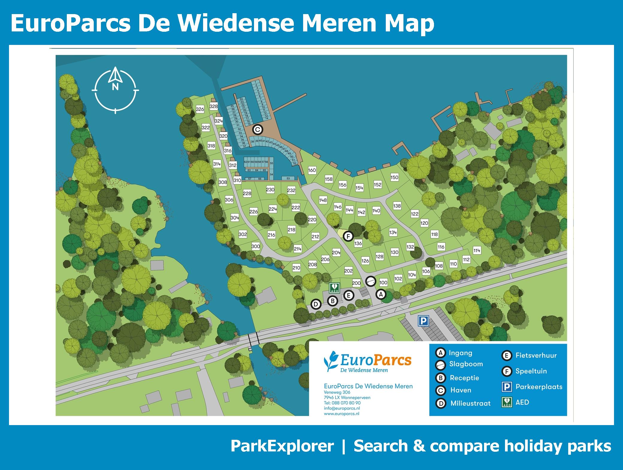 Up-to-date and comprehensive village map of De Wiedense Meren with all accommodations and facilities, also available as PDF.