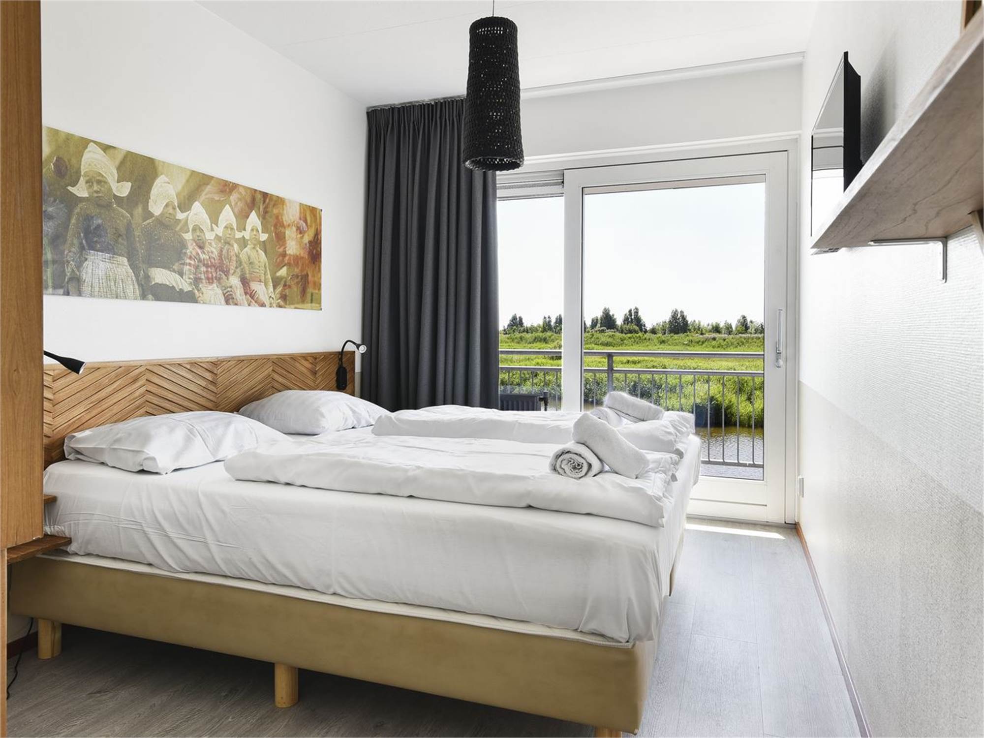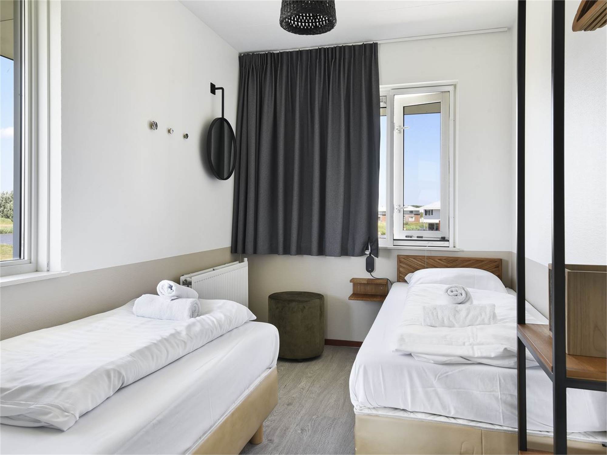 Bedroom with two single box spring beds and TV on the first floor