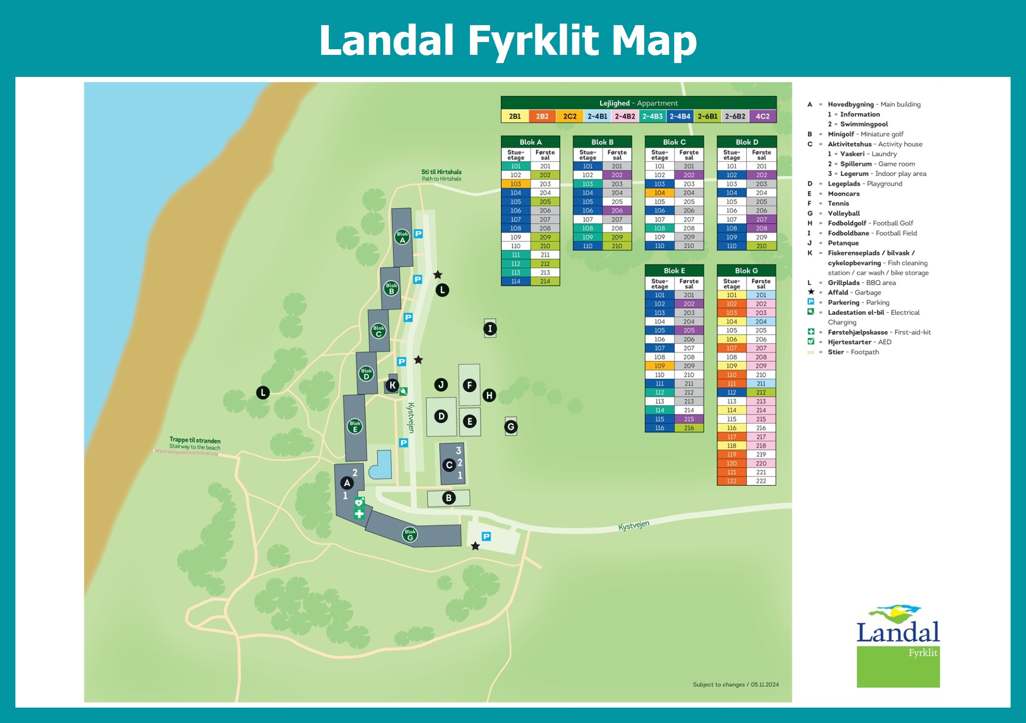 Up-to-date and comprehensive village map of Landal Fyrklit with all accommodations and facilities, also available as PDF.