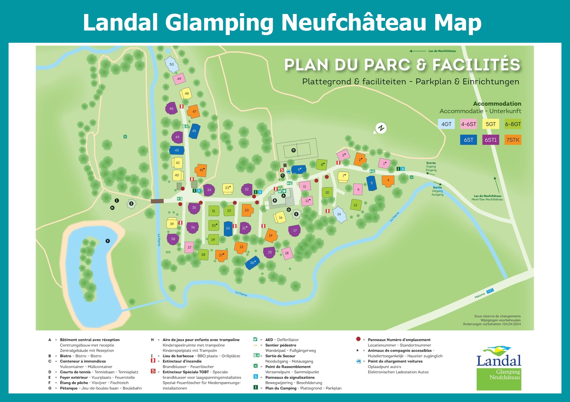 Up-to-date and comprehensive village map of Landal Glamping Neufchâteau with all accommodations and facilities, also available as PDF.