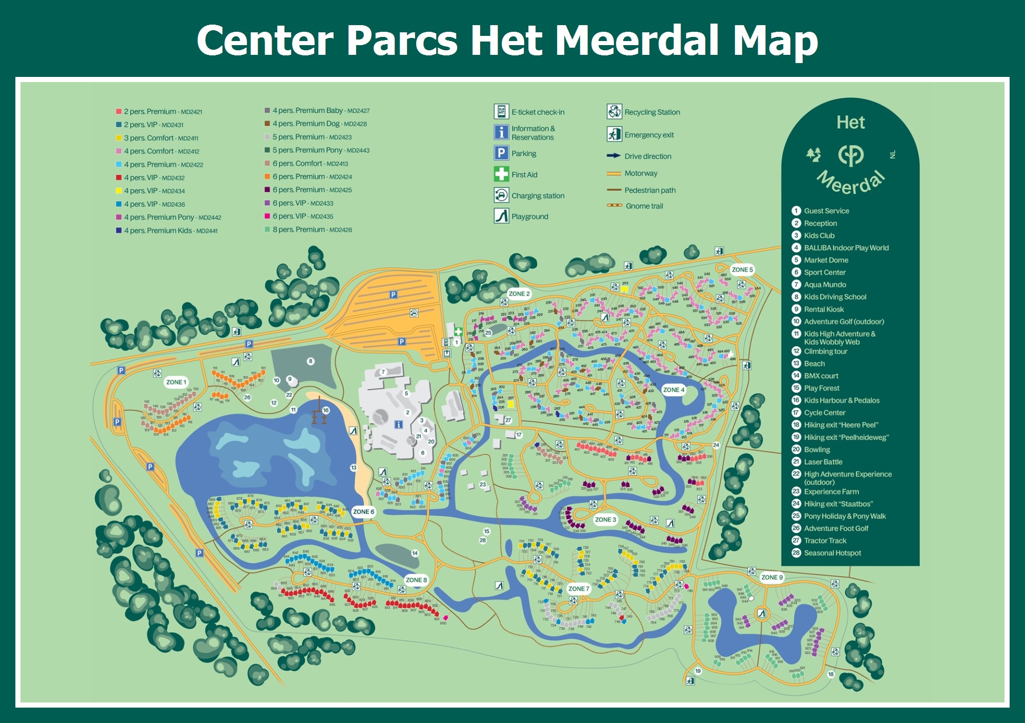 Up-to-date and comprehensive village map of Center Parcs Het Meerdal with all accommodations and facilities, also available as PDF.