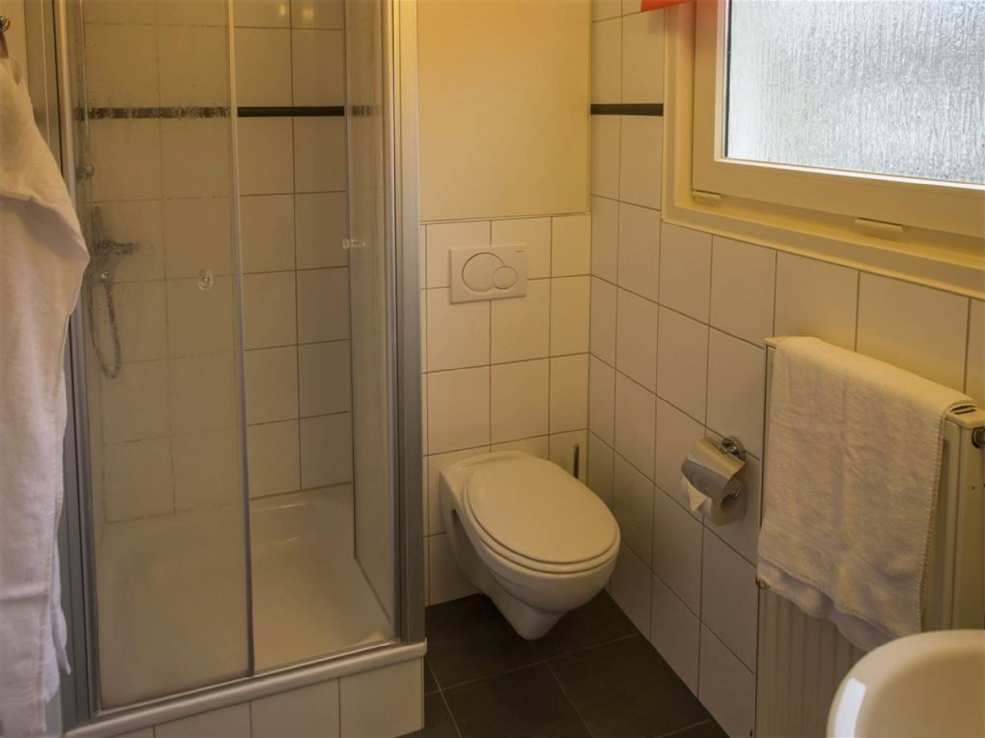 Bathroom with shower cubicle, washbasin and toilet