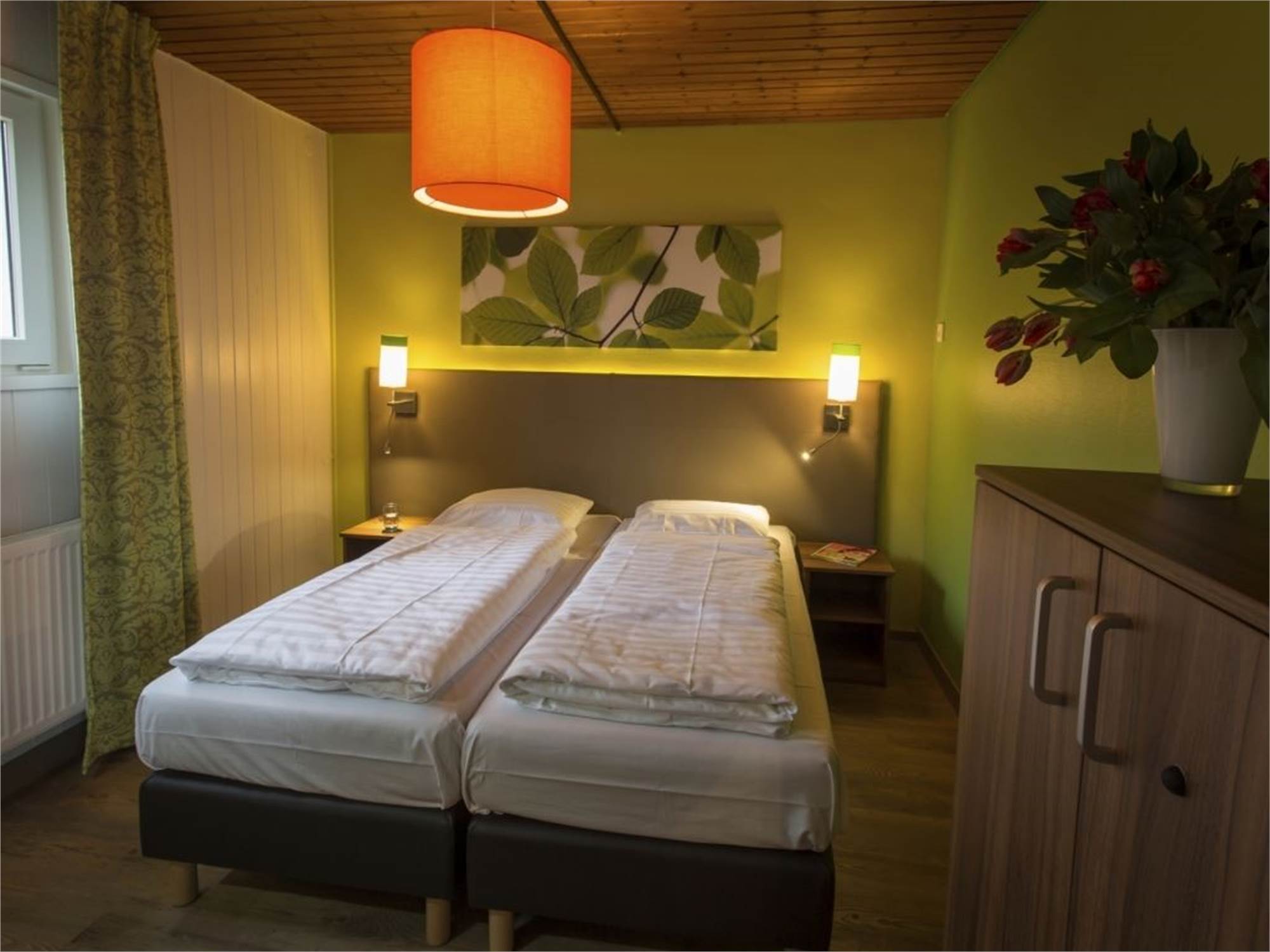 Bedroom with two single beds, 2 person soft mattress topper and flatscreen TV