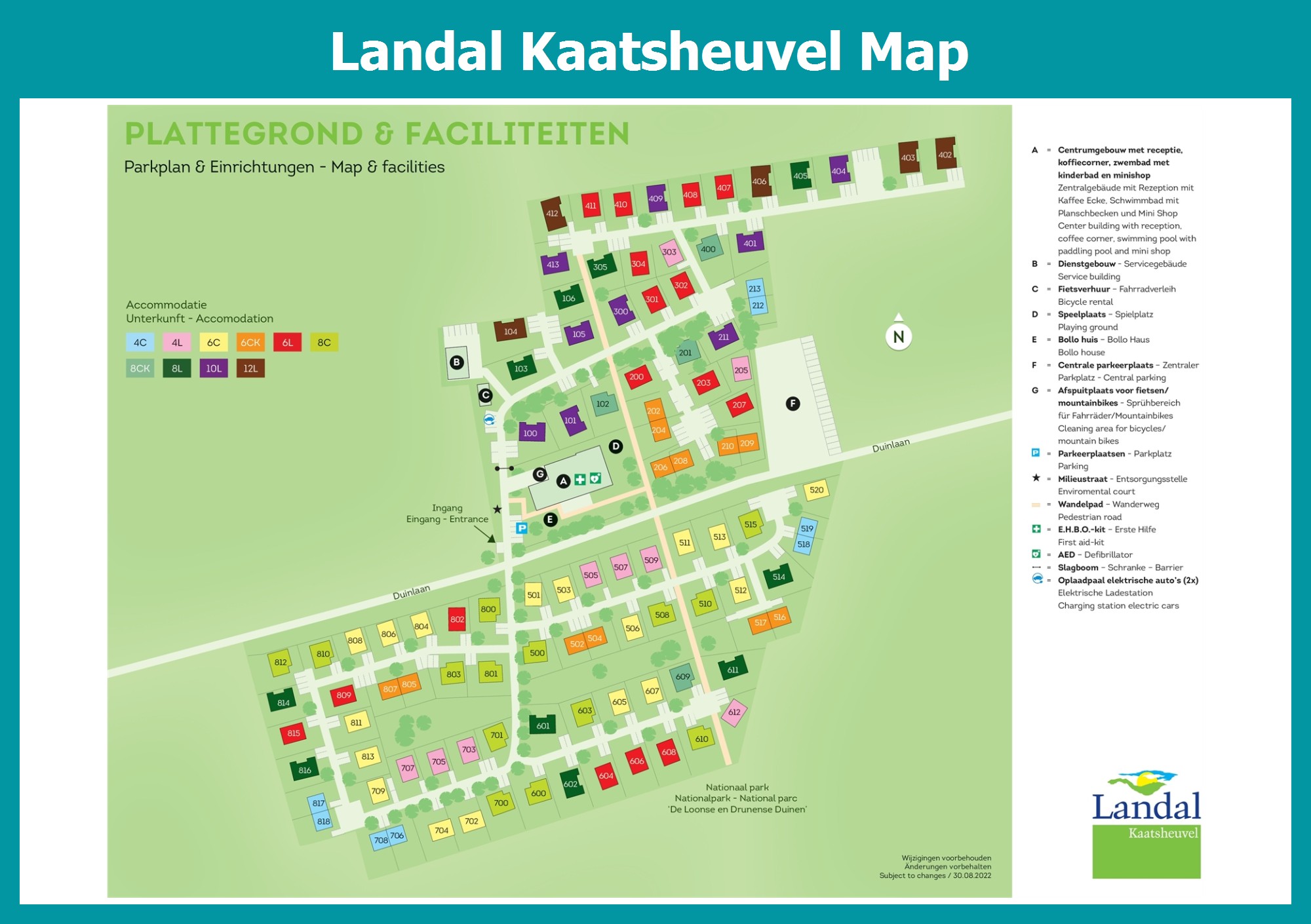 Up-to-date and comprehensive village map of Landal Kaatsheuvel with all accommodations and facilities, also available as PDF.