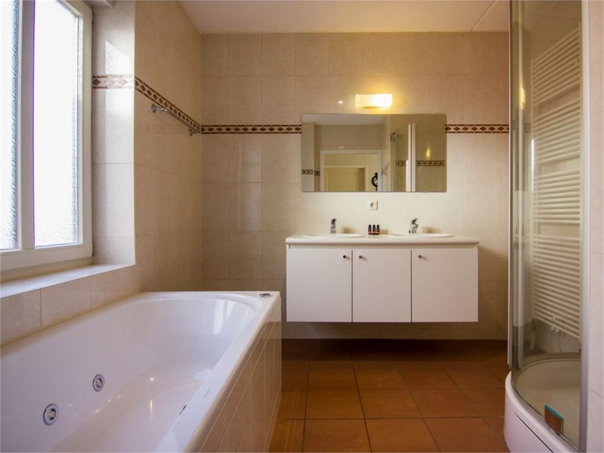 Bathroom with jacuzzi bathtub, shower cubicle and double washbasin