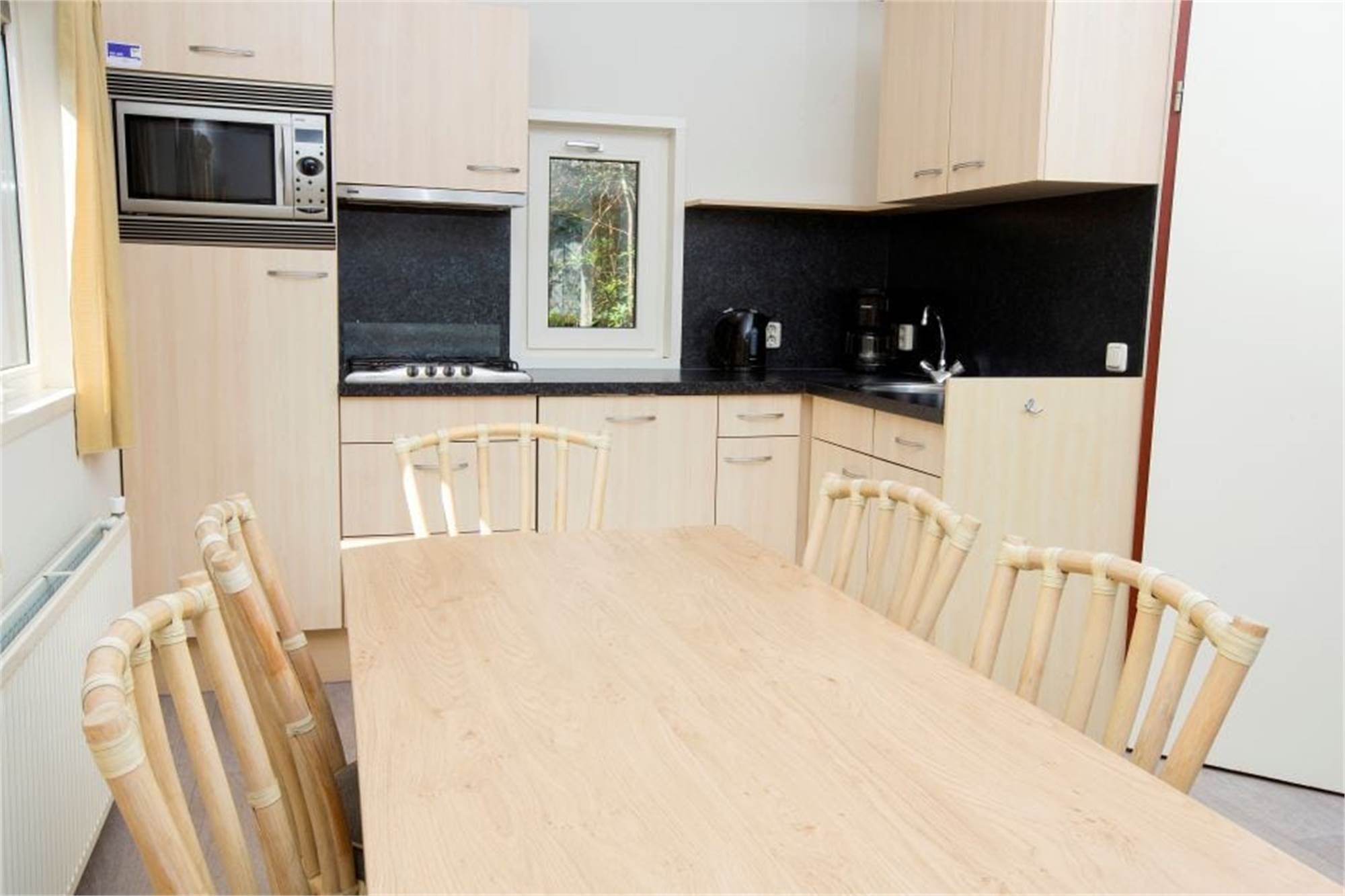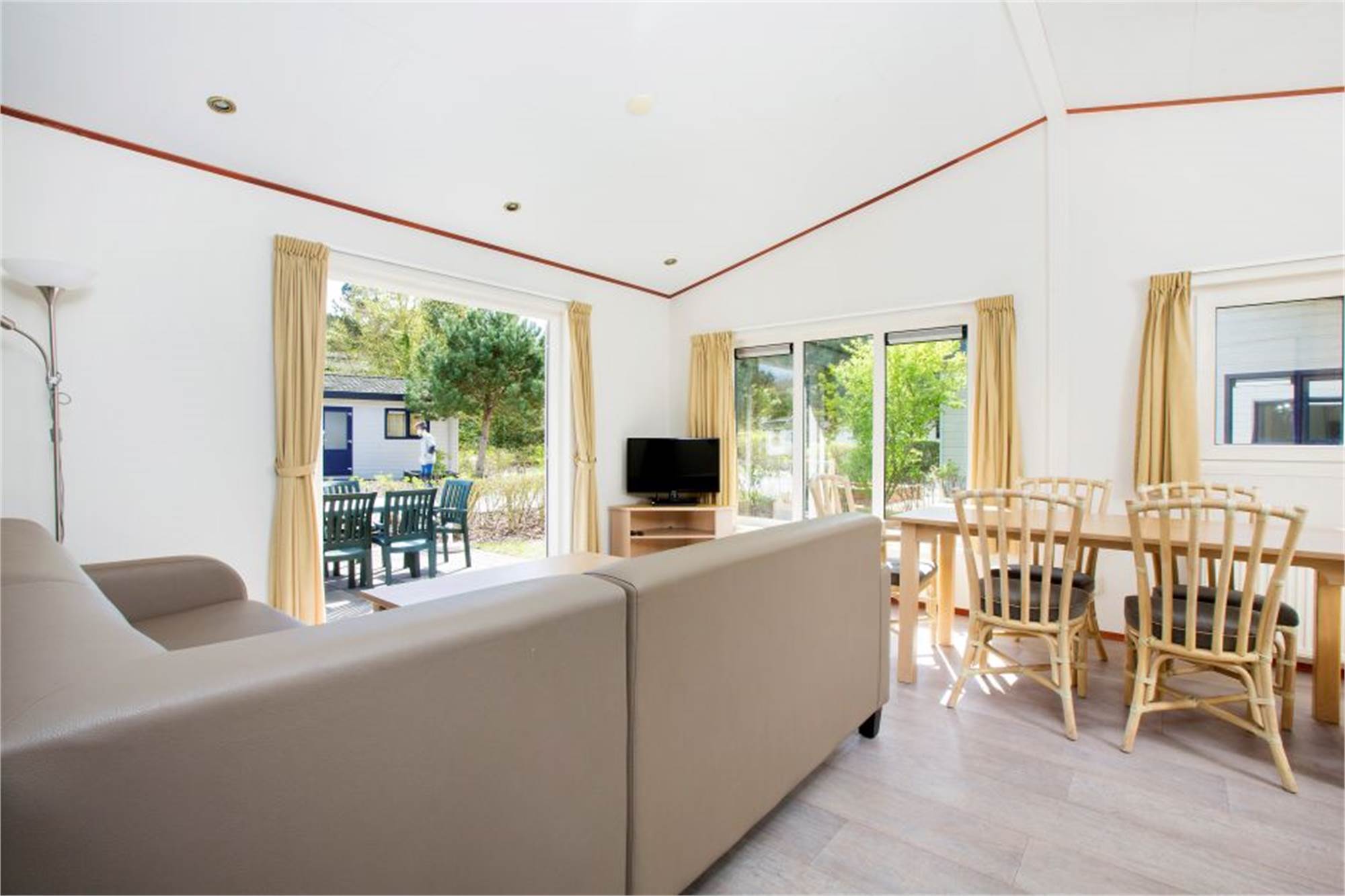 This detached chalet is suitable for 6 persons. There is a living room with dining corner and an open kitchen with dishwasher. There are 3 bedrooms, one of which has a bunkbed and the bathroom is fitted with a shower and washbasin. There is also a separate toilet. Via the patio doors you step right onto the furnished terrace, from your living room. In addition, the use of Wi-Fi is free of charge.