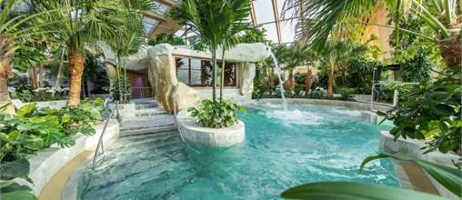 A relaxation area with a range of facilities for a deeply pampering experience: sauna with panoramic views, hammams, indoor and outdoor pools with water features, salt cabins, hot and cold tubs, sensory showers, etc.
