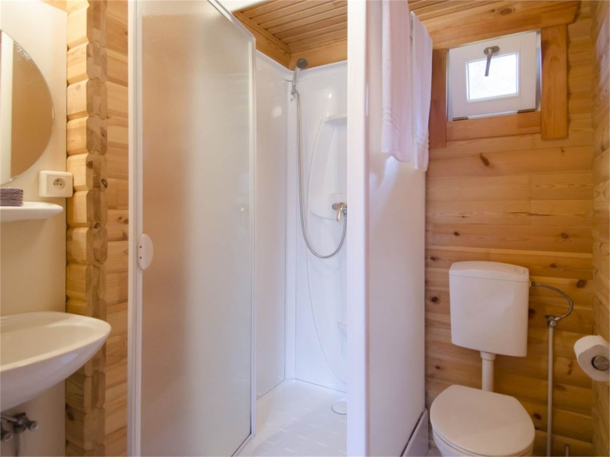 Bathroom with shower cubicle, washbasin and toilet