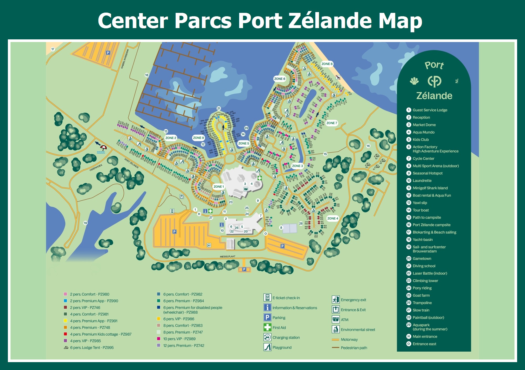 Up-to-date and comprehensive village map of Center Parcs Port Zélande with all accommodations and facilities, also available as PDF.