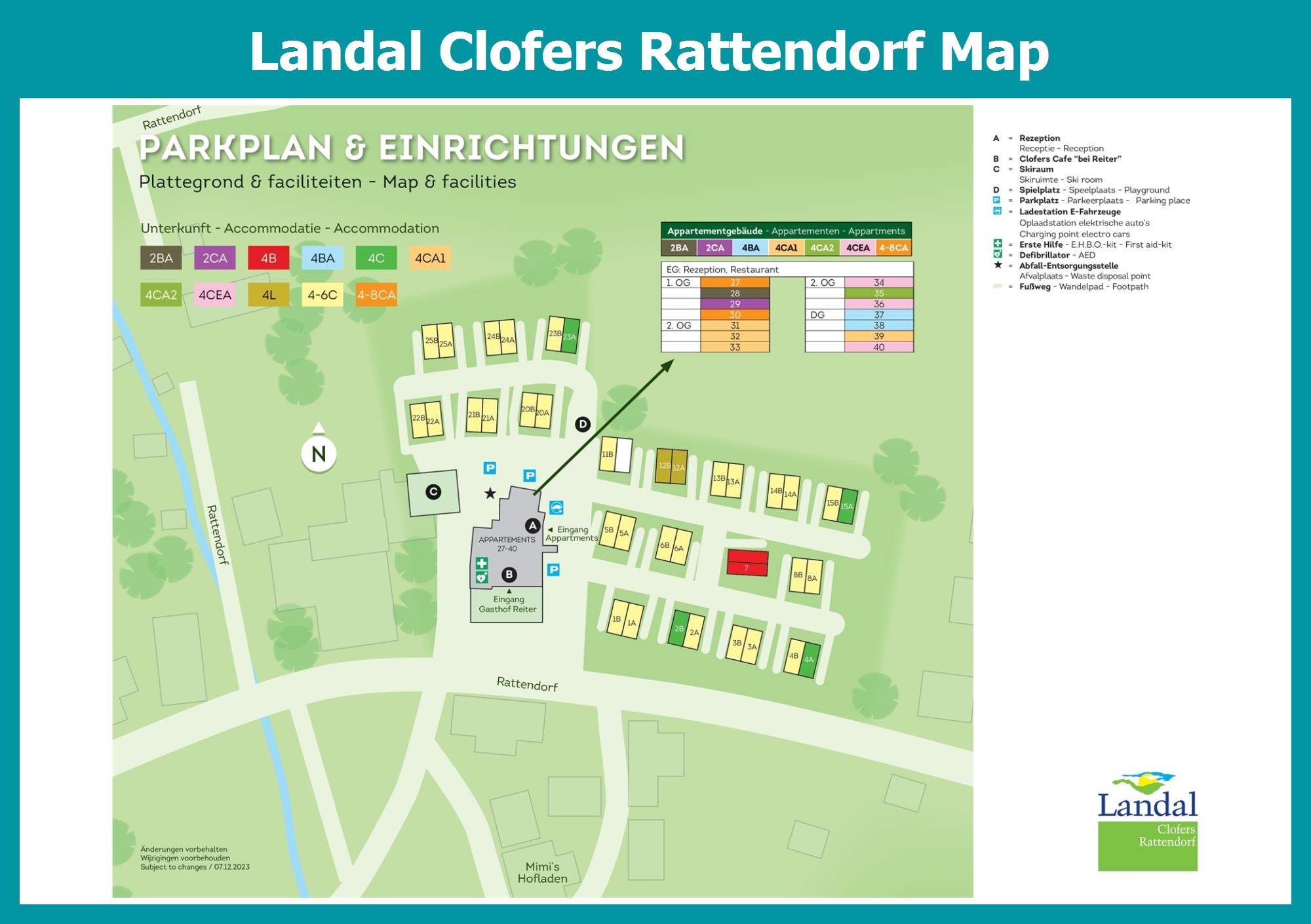 Up-to-date and comprehensive village map of Landal Clofers Rattendorf with all accommodations and facilities, also available as PDF.