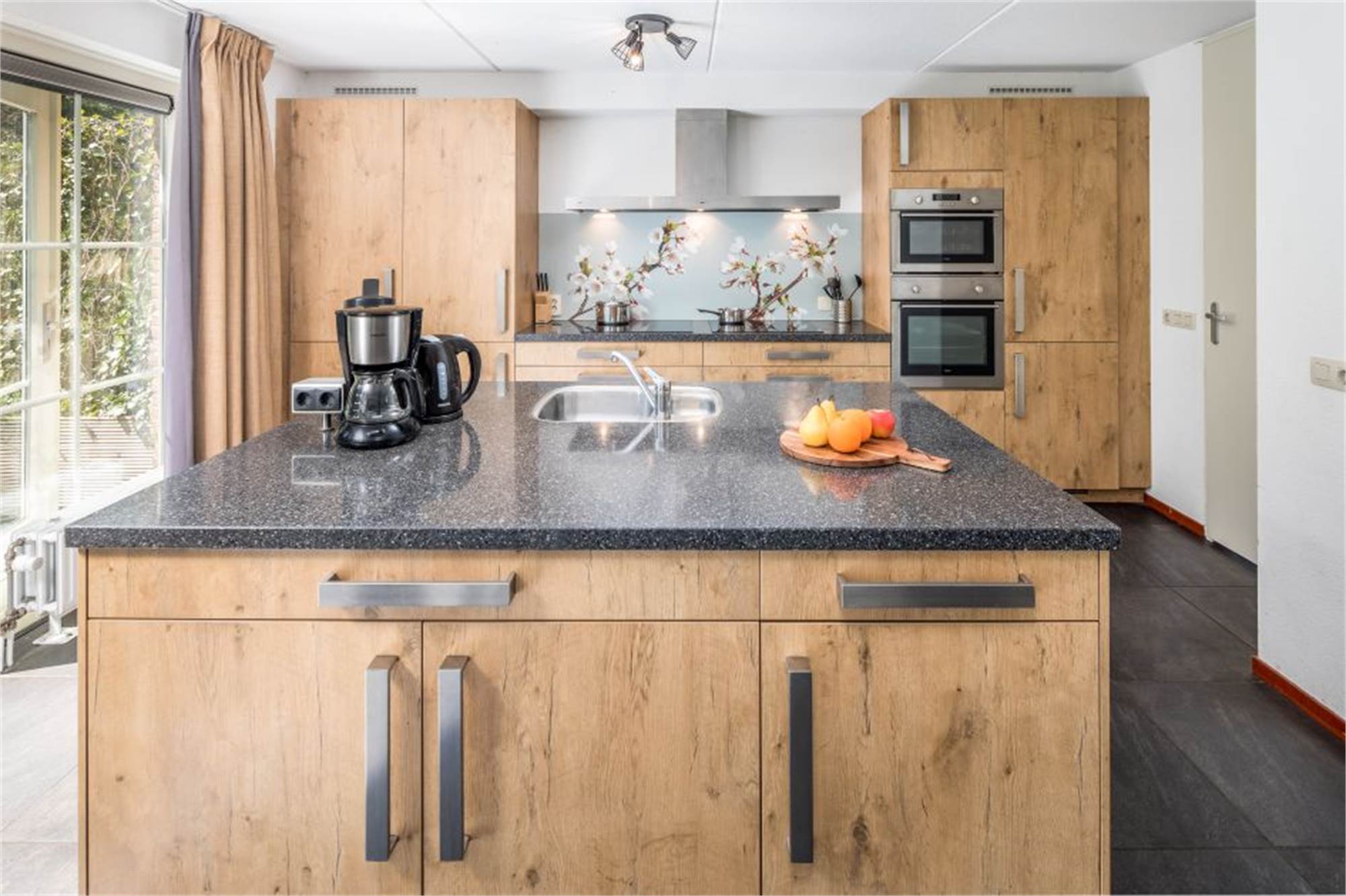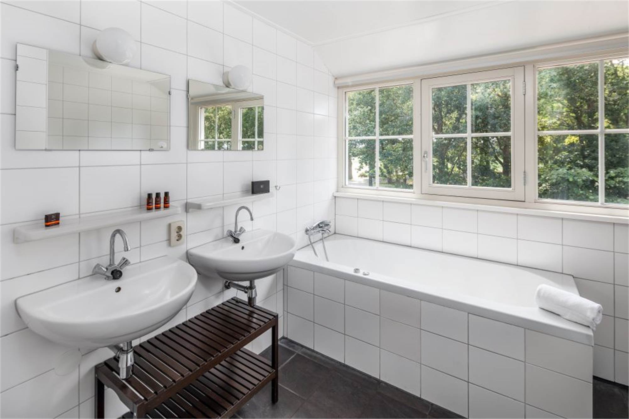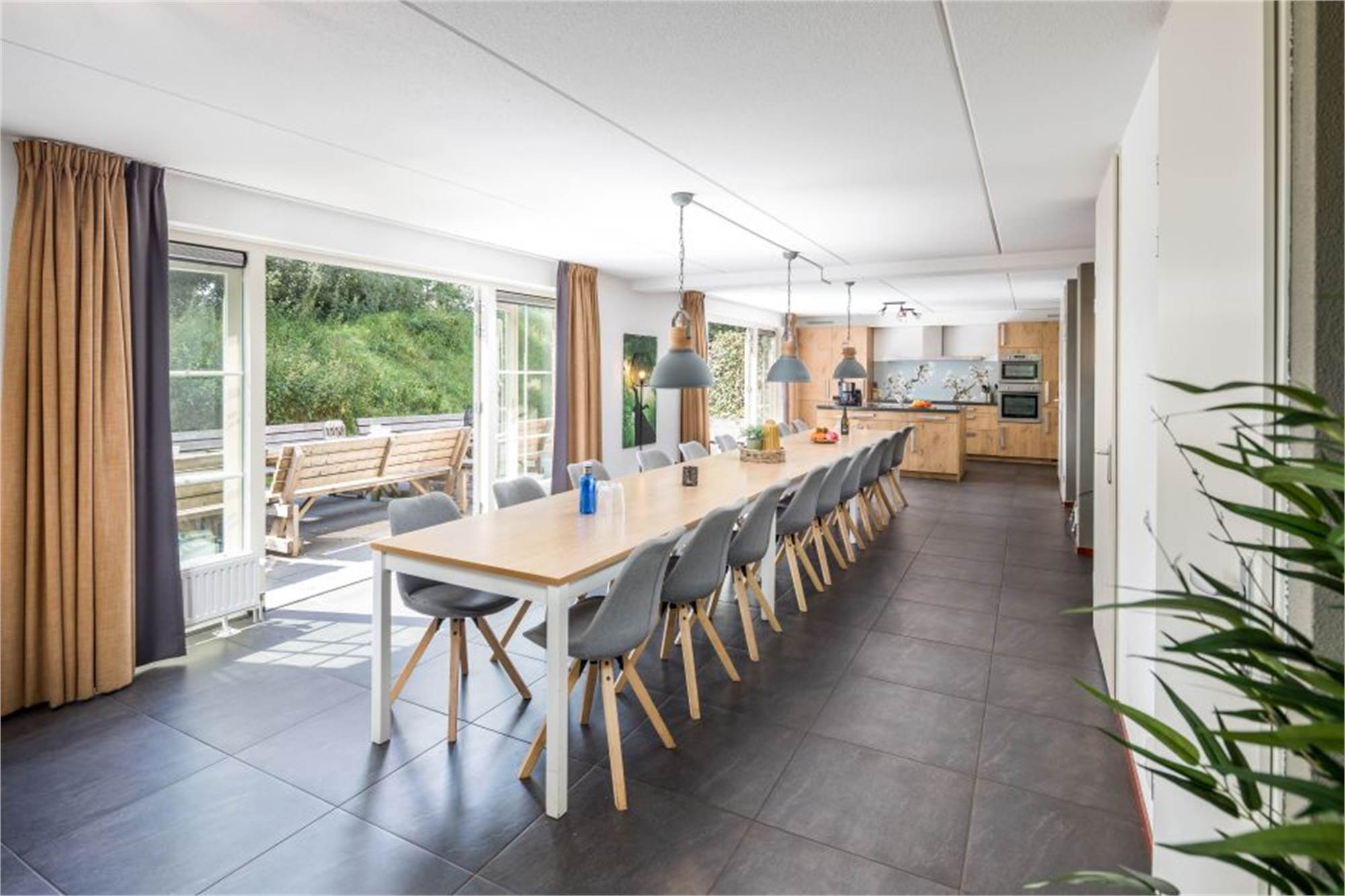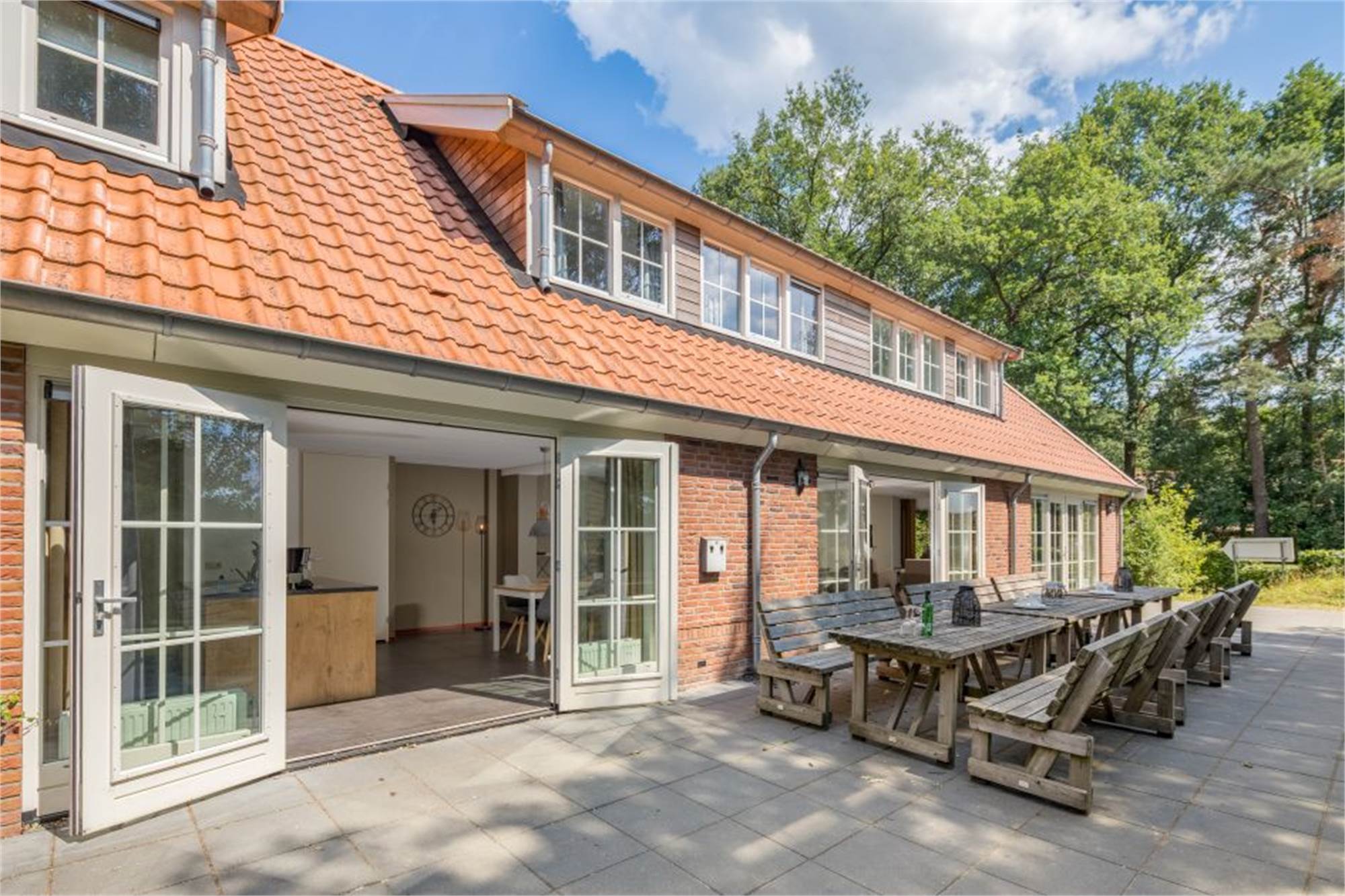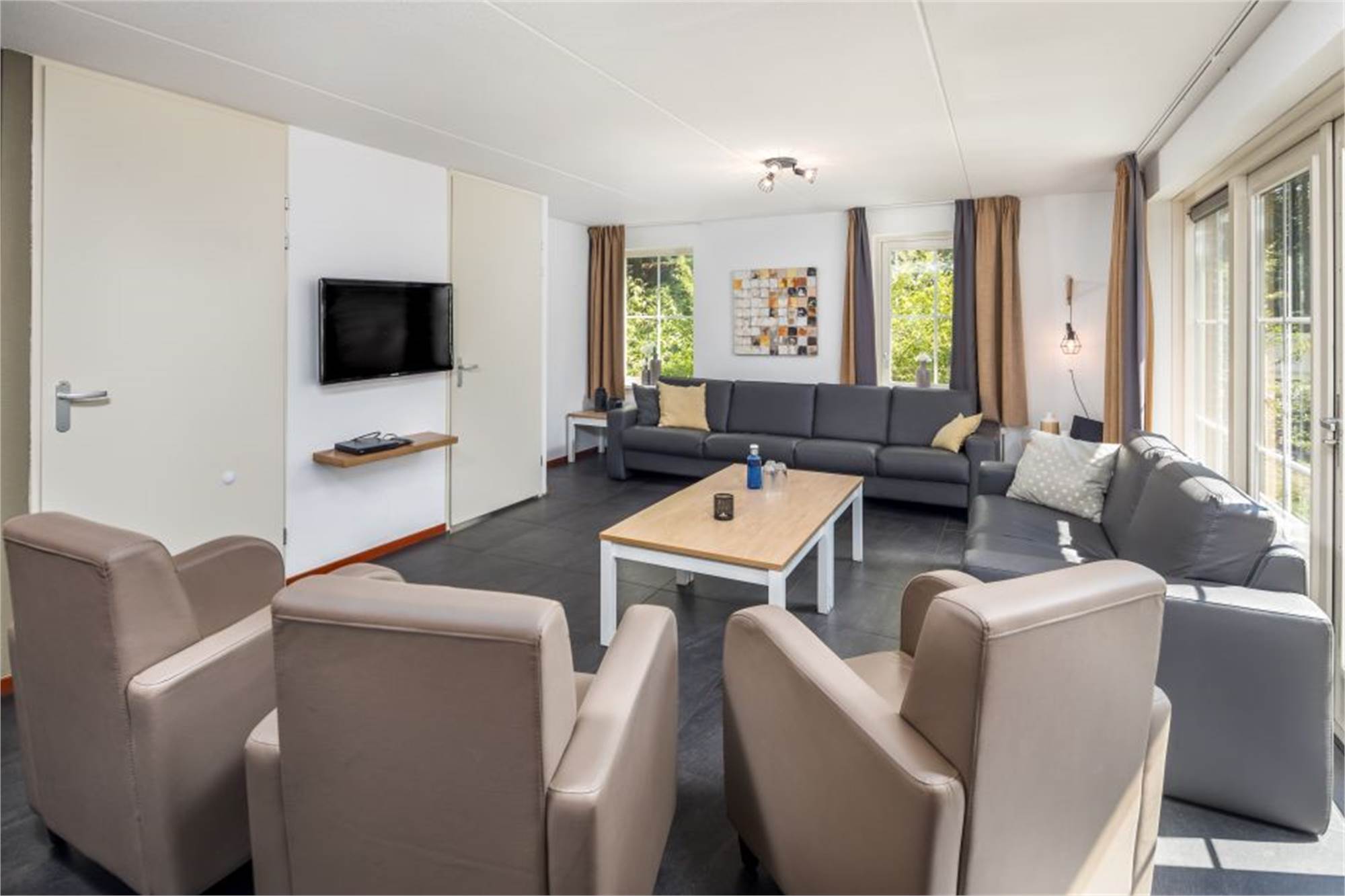Ground floor: spacious living room with free Wi-Fi access, flatscreen tv, DVD player and living and dining area with combination microwave, oven, two refrigerators with freezer, coffeepad machine and two dishwashers. Three bathrooms with showers and washbasins. Three bedrooms with two single box spring beds each. Washing machine, dryer and separate toilet. Storage room.