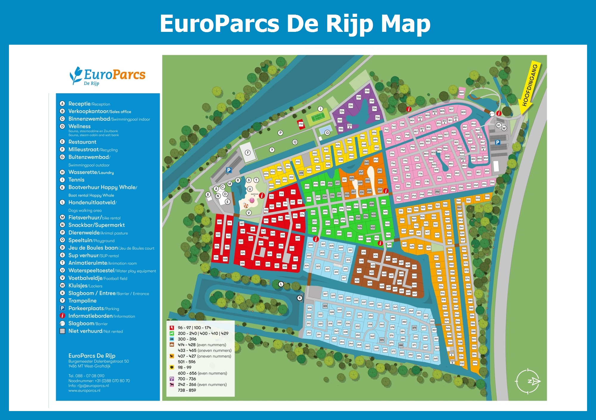 Up-to-date and comprehensive village map of EuroParcs De Rijp with all accommodations and facilities, also available as PDF.