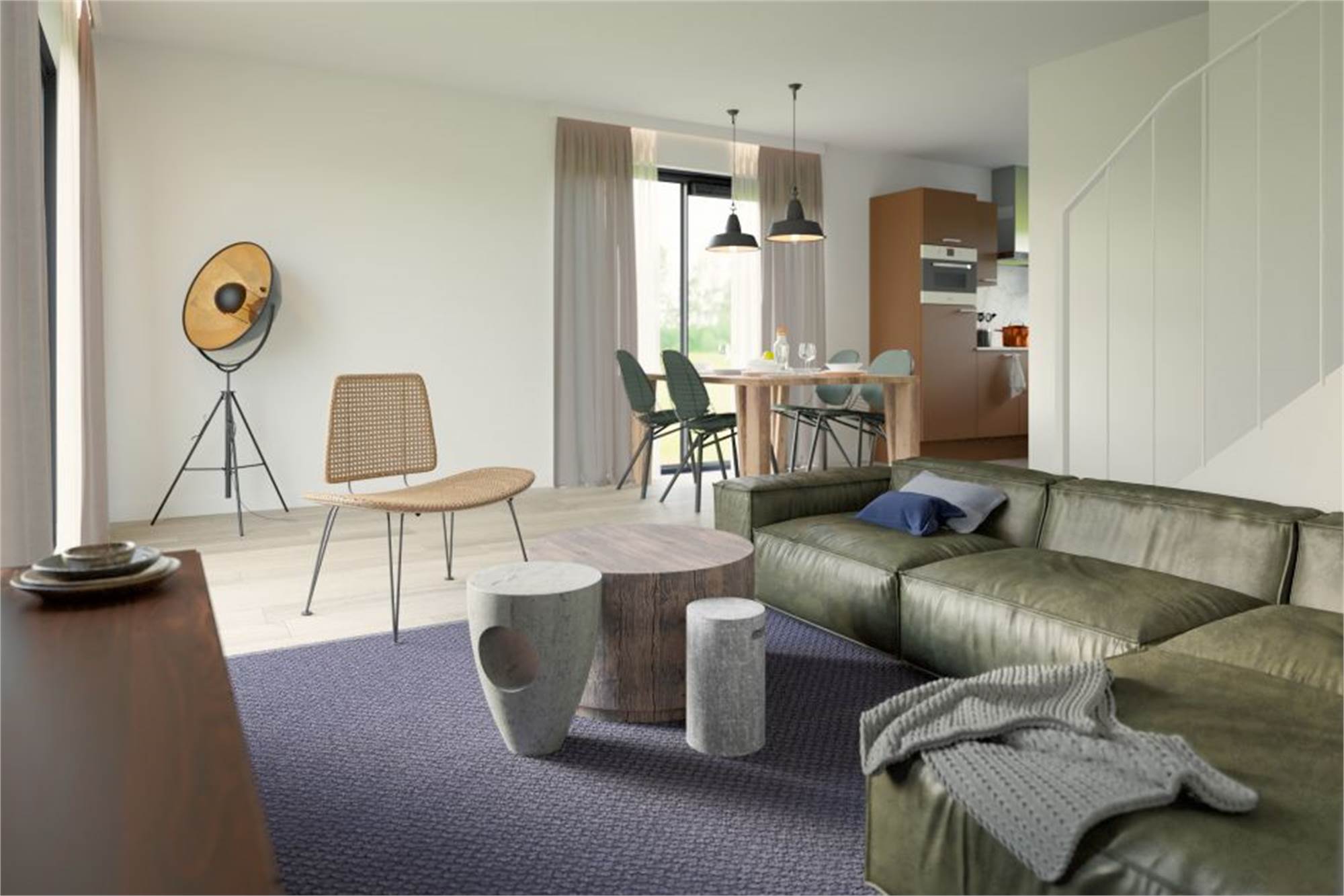 • The living room has a seating area with corner sofa, a TV and dining table with chairs.