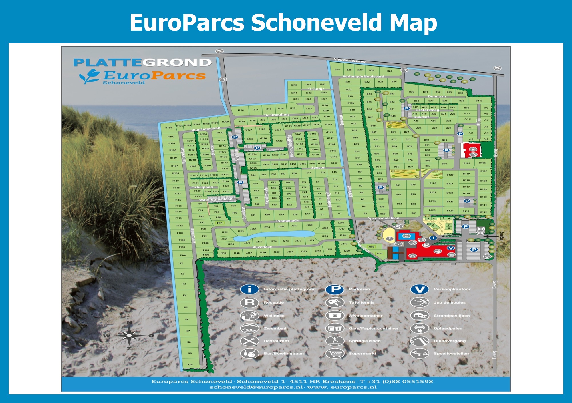 Up-to-date and comprehensive village map of EuroParcs Schoneveld with all accommodations and facilities, also available as PDF.
