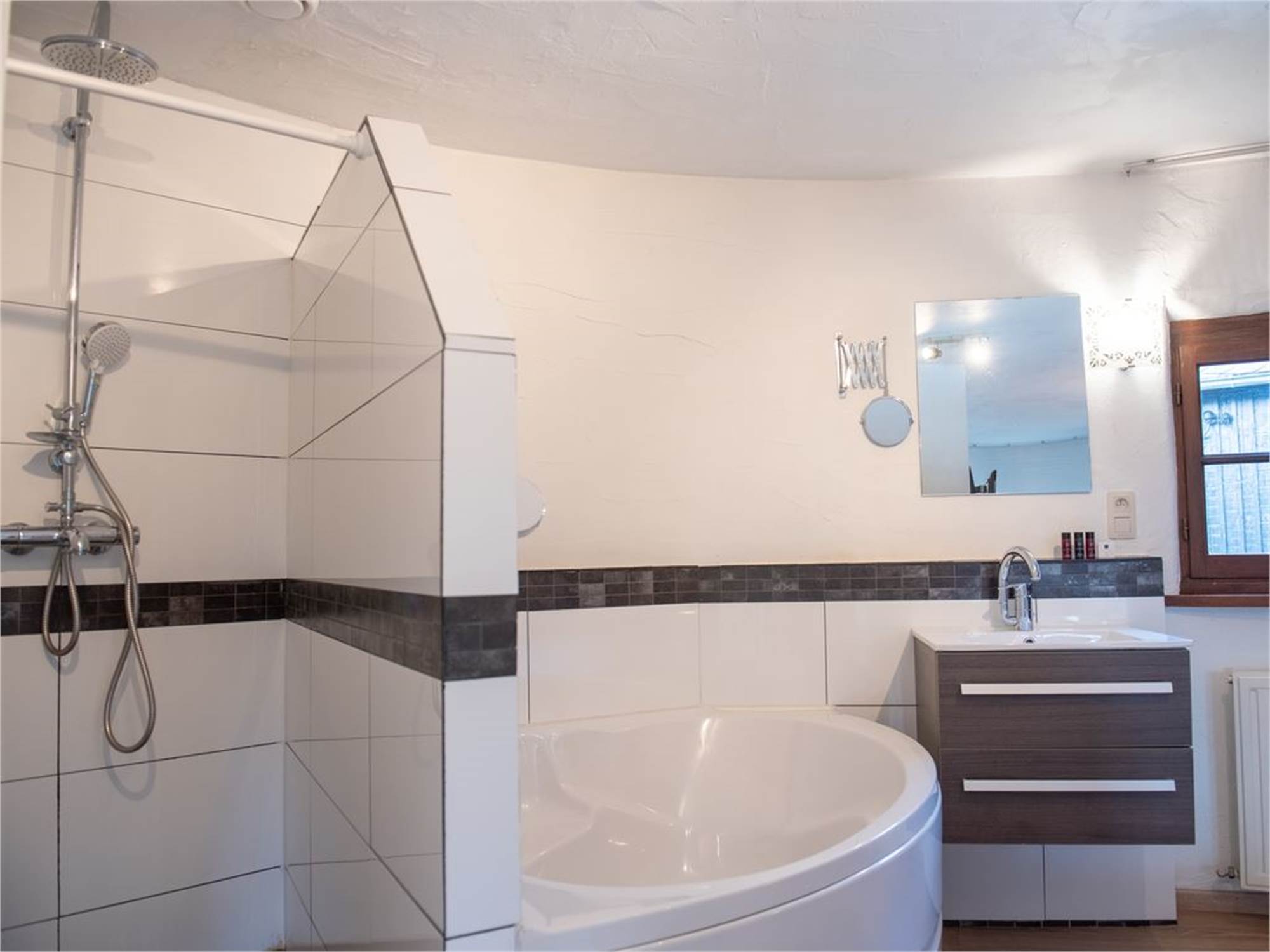 Bathroom with bathtub or shower cubicle, washbasin and toilet on the first floor