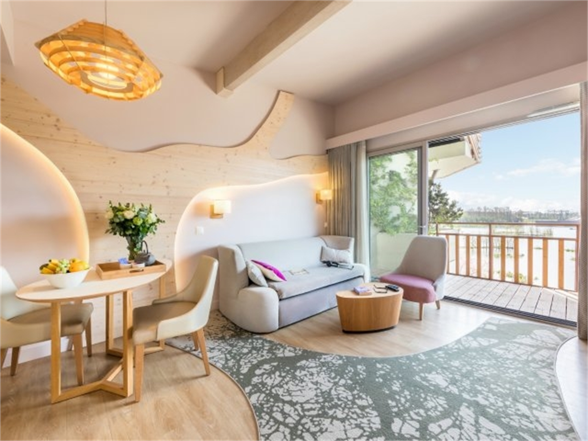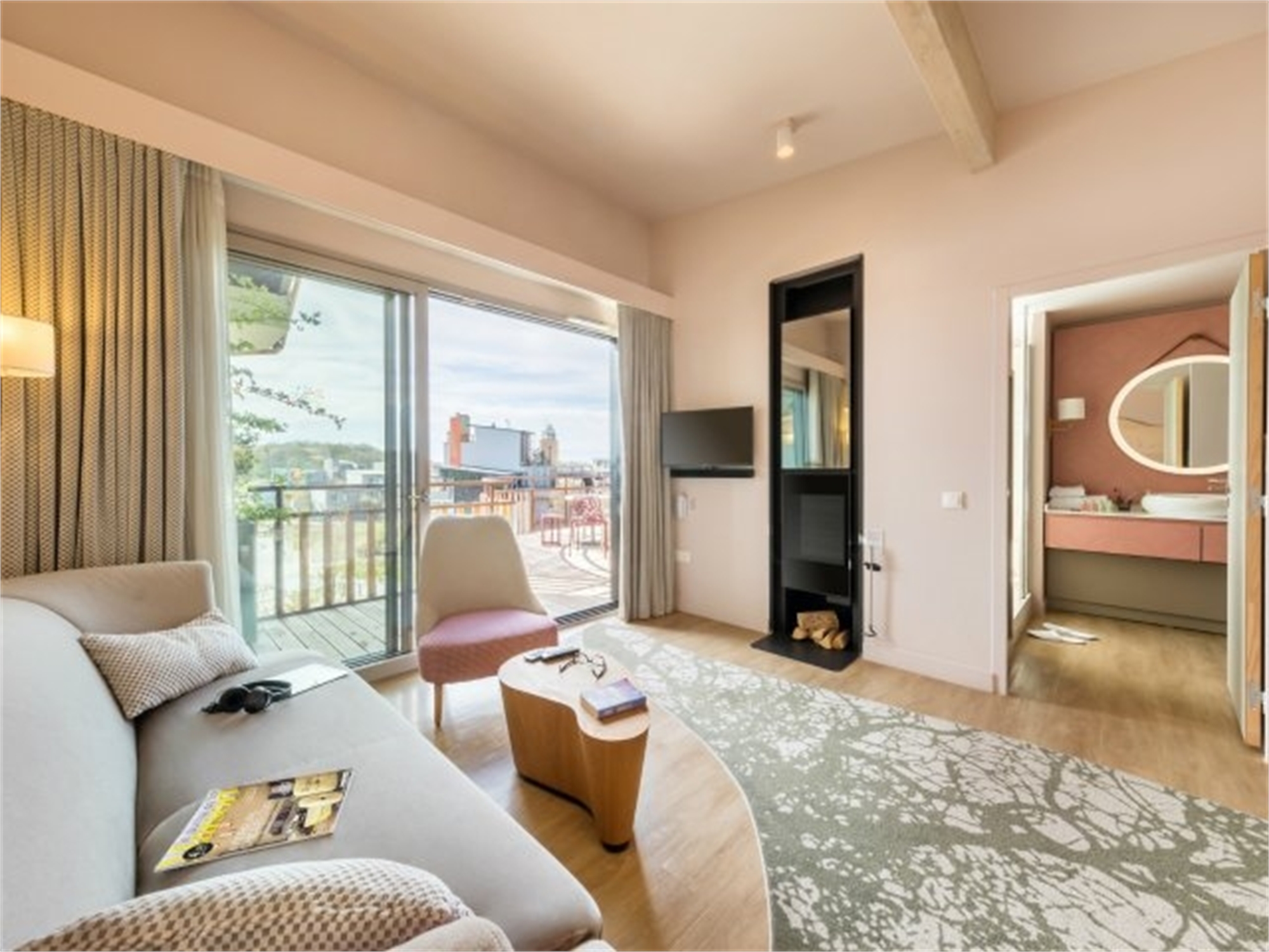Living room with fireplace, flat screen TV, stereo. Large floor-to-ceiling windows look out onto the balcony furnished with garden furniture