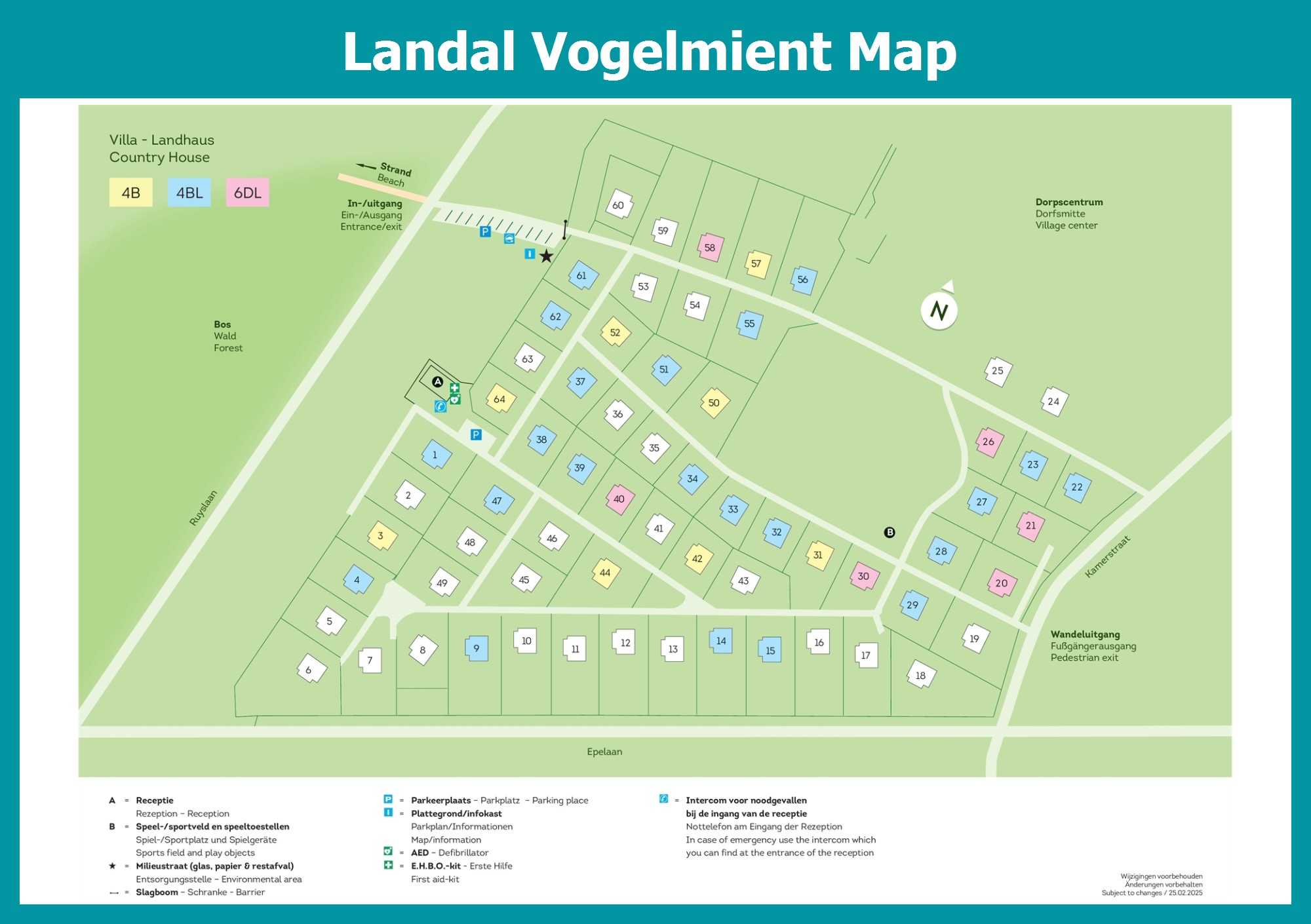 Up-to-date and comprehensive village map of Landal Vogelmient with all accommodations and facilities, also available as PDF.