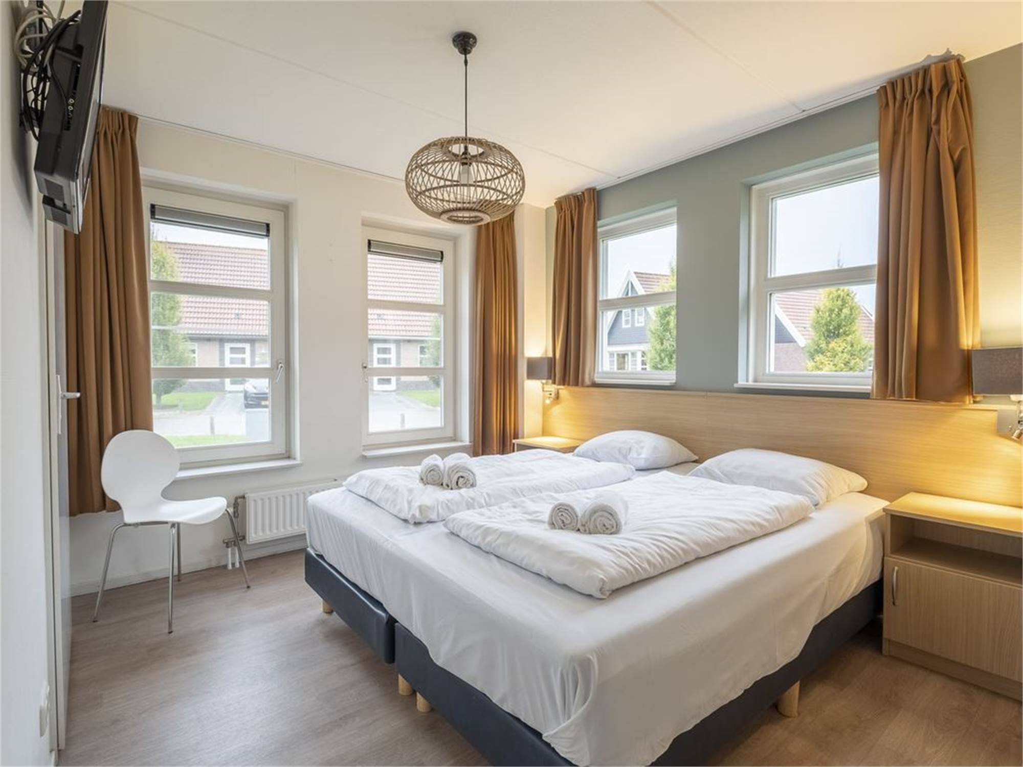 Bedroom with two single box spring beds, 2 person soft mattress topper and flatscreen TV