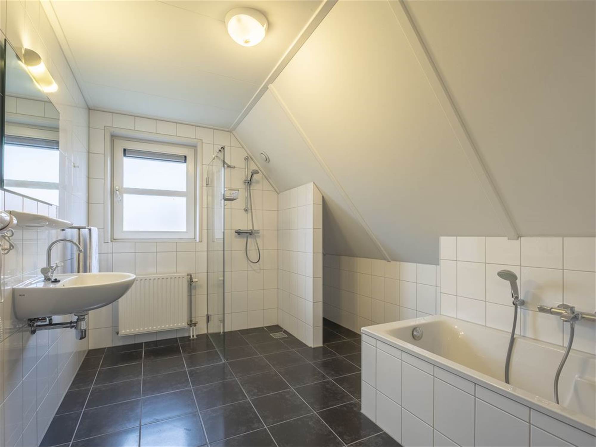 Bathroom with bathtub, shower cubicle and washbasin on the first floor