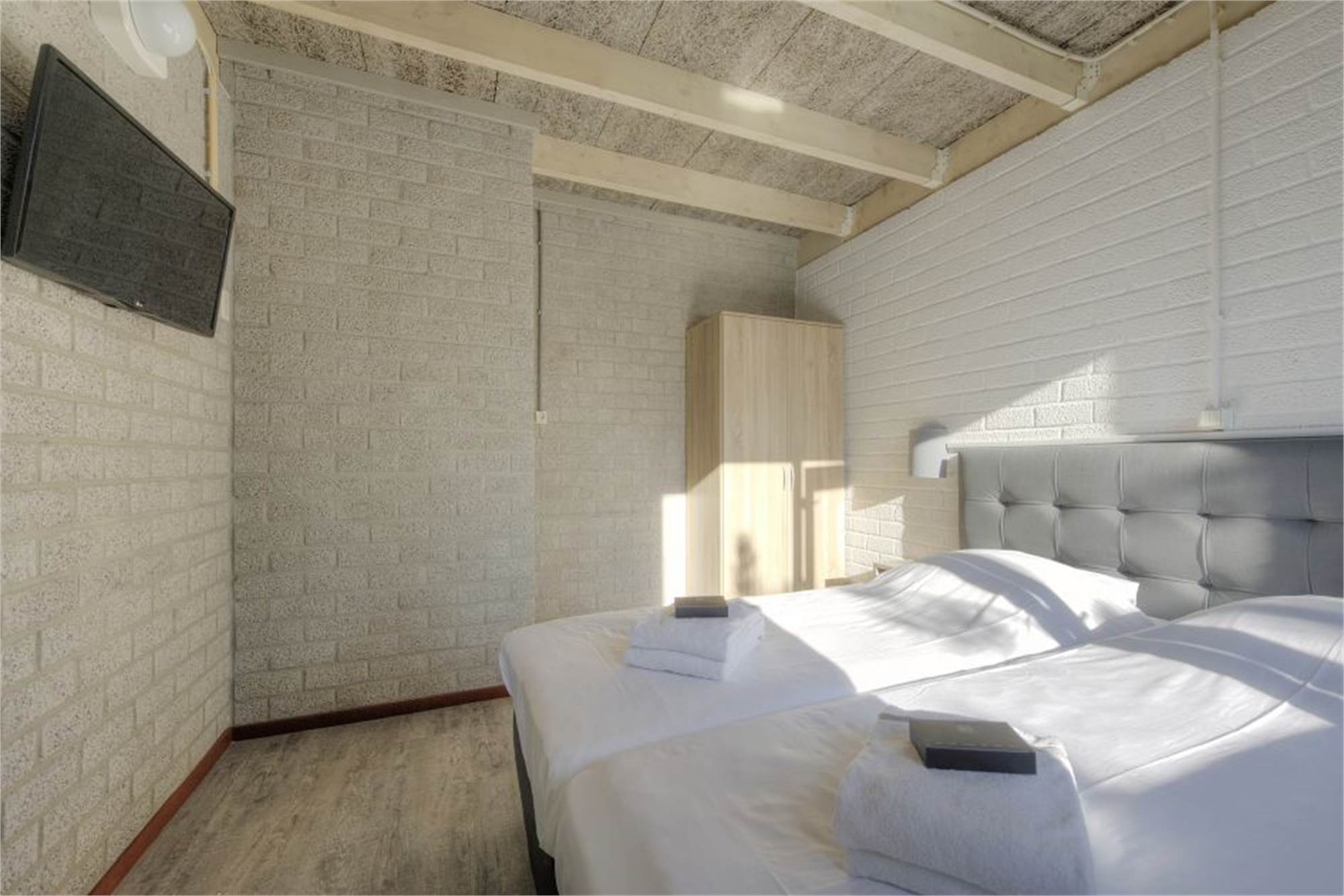 This one-level bungalow is fully restyled and suitable for 4 persons. The living room has a smart TV and open fireplace. The kitchen is equipped with a dishwasher, microwave oven, fridge/freezer and coffee machine. In addition, the bungalow has 2 bedrooms, each with 2 single beds, while one of the bedrooms has a television. There is a bathroom with rain-shower and a separate toilet. Furthermore the bungalow has an infrared sauna. Outside you will find a furnished terrace and use of Wi-Fi is free of charge.